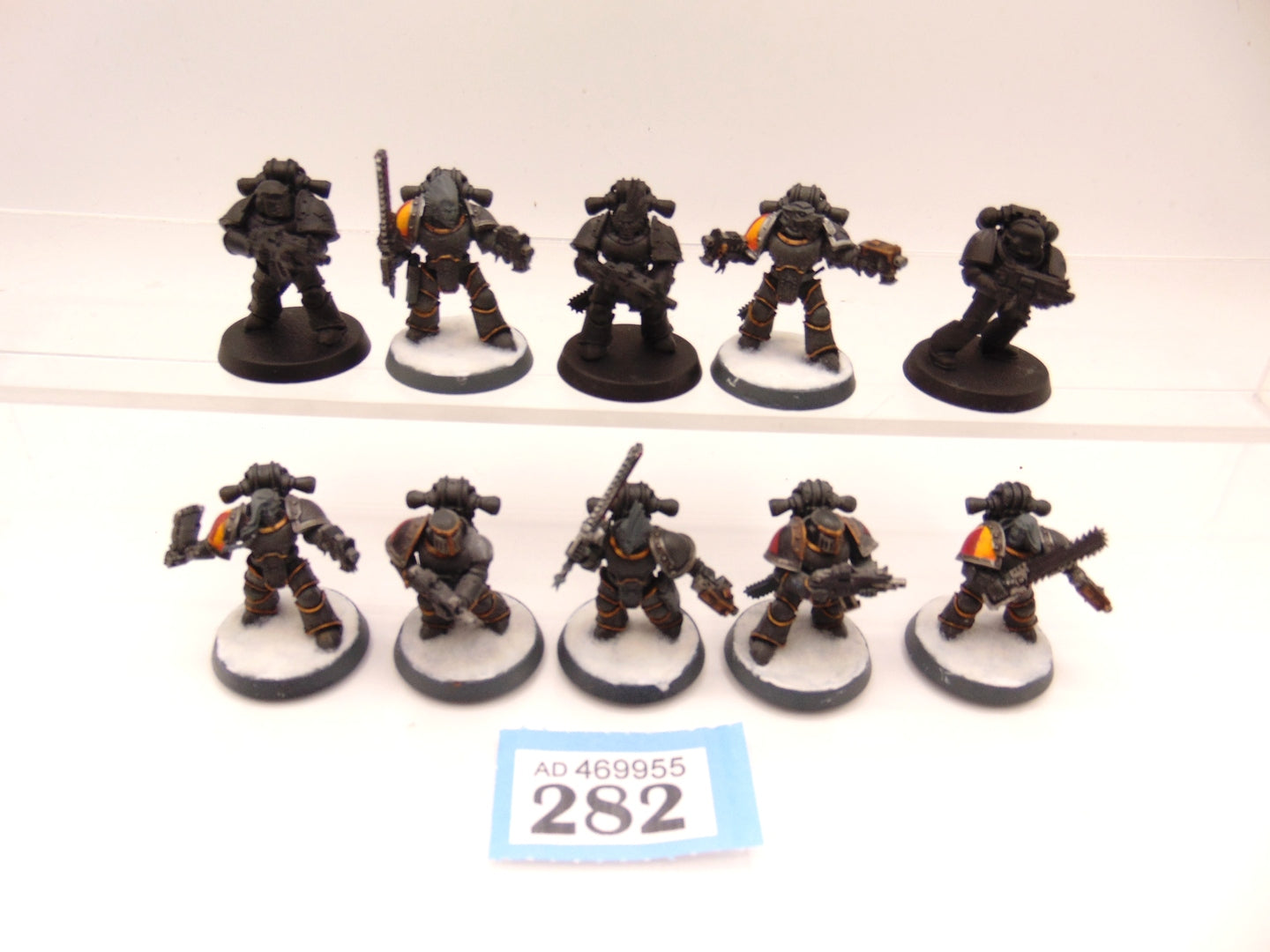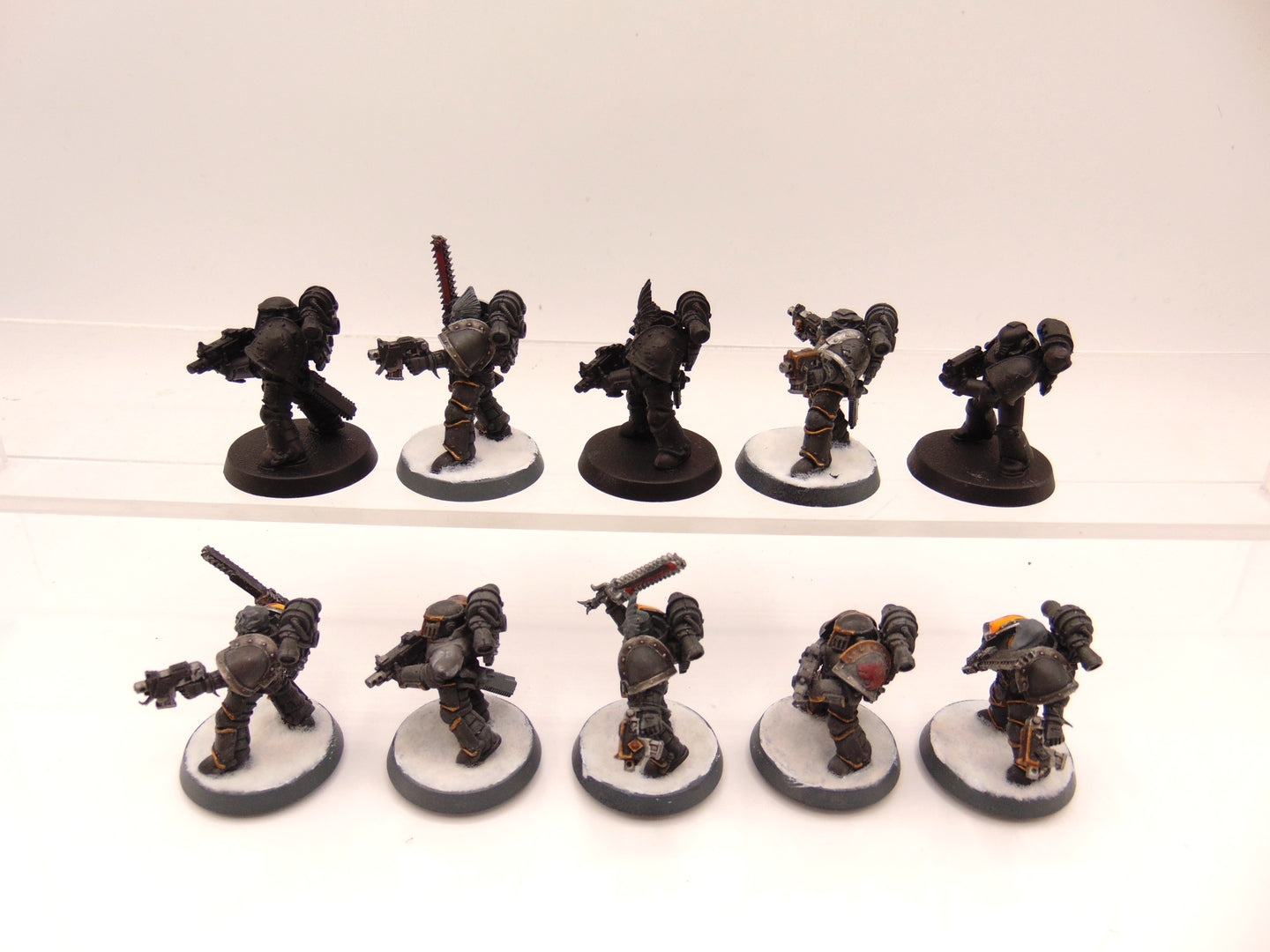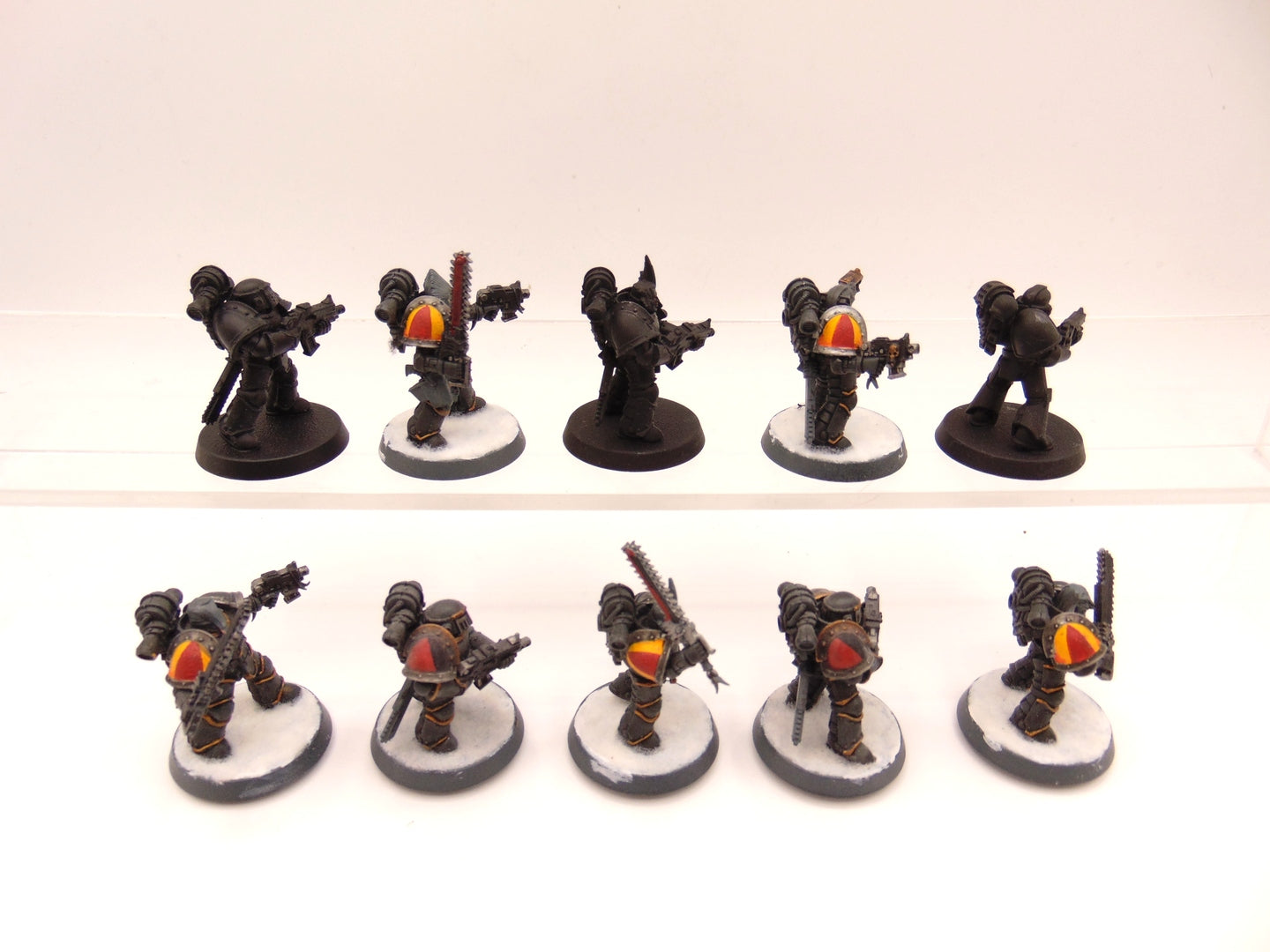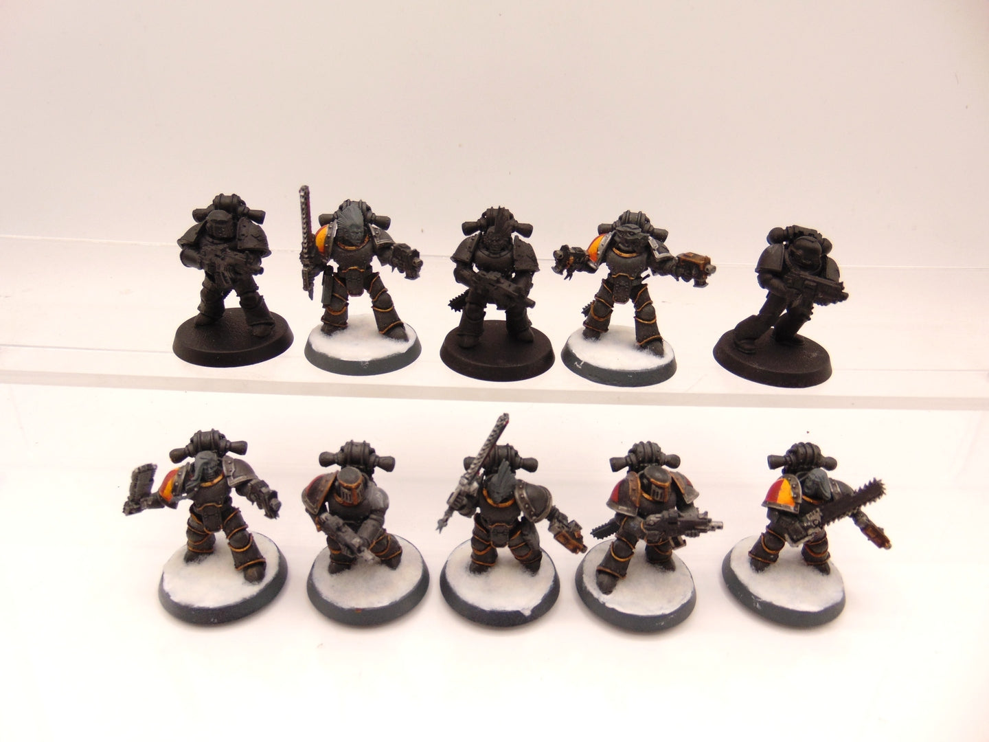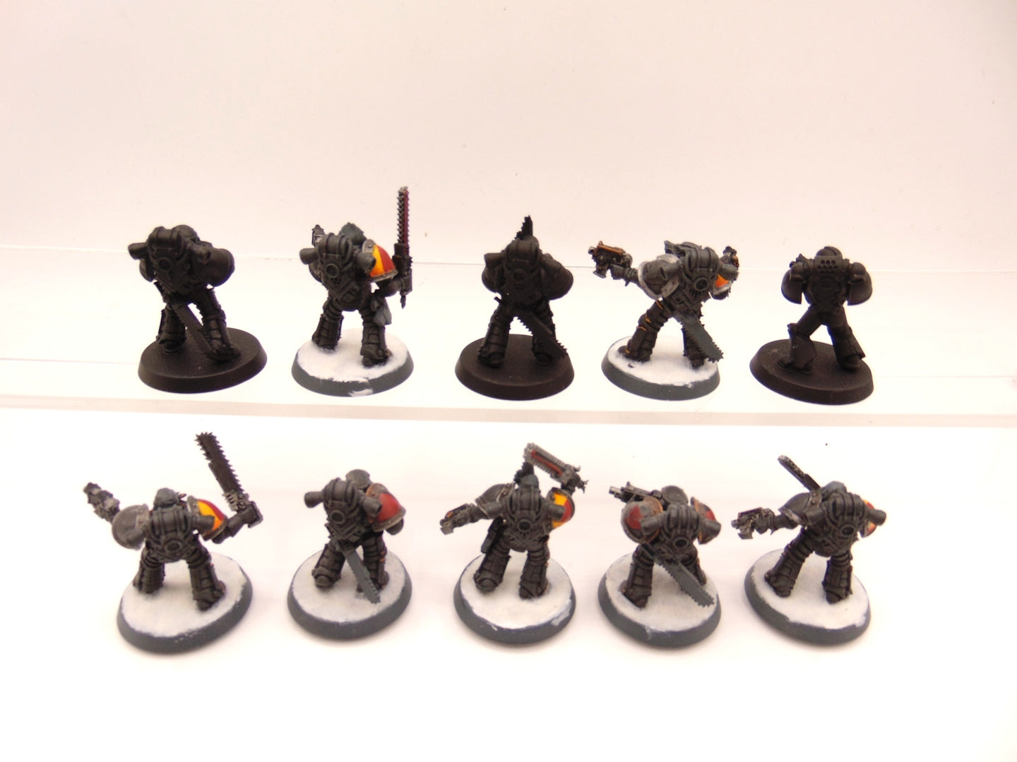 Built using MKIII and MKIV marines. Some models have Forge World Shoulder Pads. One is missing a pad.